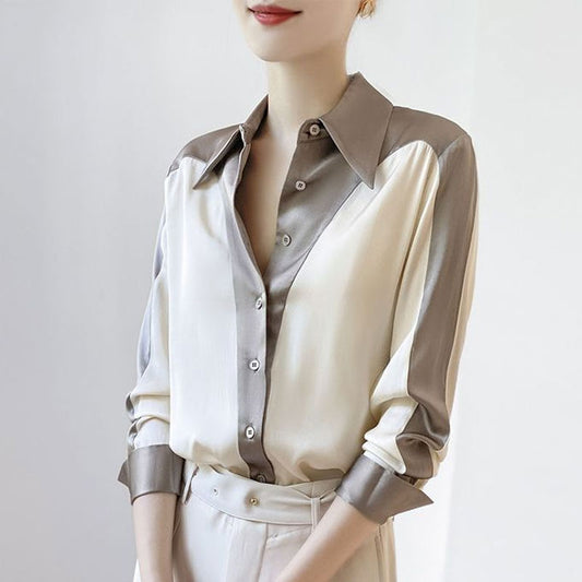Streetwear Solid Color Patchwork All-match Shirt Women's Clothing Stylish Single-breasted Spring Autumn Commute Polo-Neck Blouse